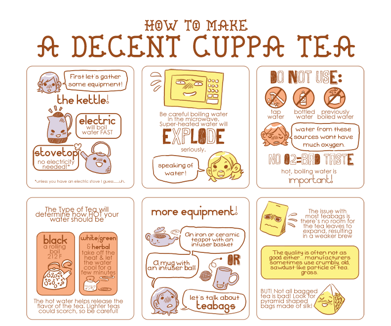 Below is a charming guide via whatpeoplebrew.tumblr.com, a blog in which the owner pairs different tea with different characters from pop culture. For example she pairs Bilbo Baggins from the Hobbit with Irish breakfast tea  and Moriarty from Sherlock with Chai Tea. Fandoms aside, this fantastic guide is a wonderful source that goes through the numerous ways you can make a good “cuppa tea”: